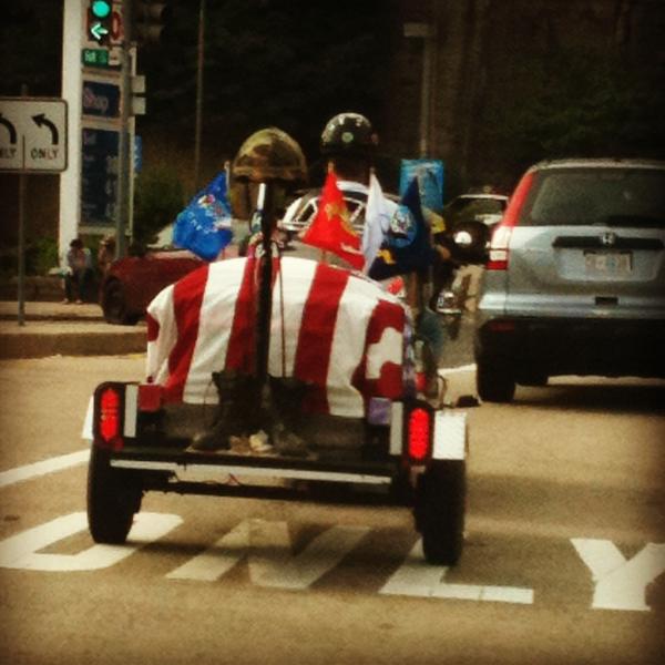 Saw this American flag draped casket with soldier helmet pulled by a motorcycle #FreedomIsntFree #USApic.twitter.com/KuLrKI2M