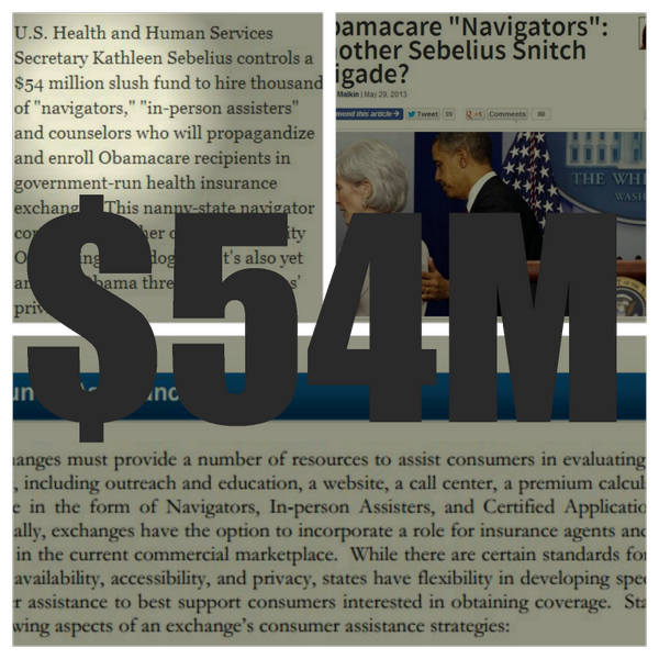 Today's #: $54M. HHS Sec. Sebelius has $54M to hire thsnds 'navigators' & 'in-person asstnts' for exchange set-up.pic.twitter.com/lx6t8bnuF7