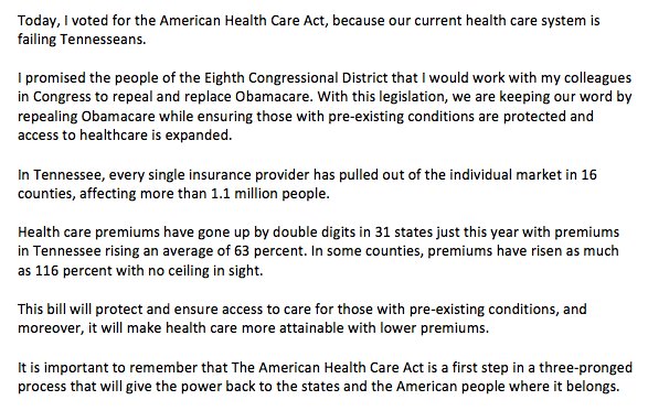You put Donald Trump's political needs over those of those of #TN08. This bill does not help those w/ pre-existing conditions. You failed us