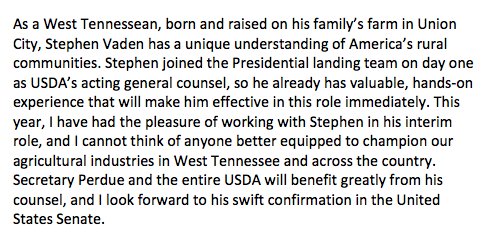 Pleased @POTUS nominated West Tennessean Stephen Vaden to be General Counsel for @SecretarySonny and @USDA. My full statement below:pic.twitter.com/M1A7g8Kwom