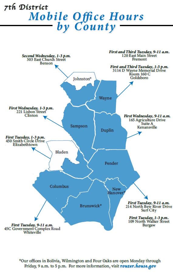 Members of my staff hold mobile office hours in each county of #NC07 to ensure that everyone has as much access to our team as possible. Please RT our updated list of the hours and locations.pic.twitter.com/NbDra5zm7l