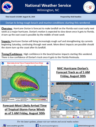 As we continue to monitor Hurricane Dorian please exercise caution — especially if you are headed to the beach this weekend. The latest briefing for Southeastern North Carolina can be found below. #NC07https://twitter.com/NWSWilmingtonNC/status/1167408702841704448 …
