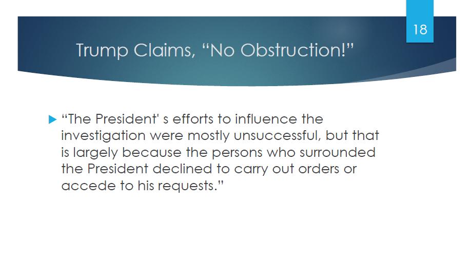 #Mueller says that President #Trump was unable to wholly undermine his investigation ONLY because other people said no.pic.twitter.com/6SuvBImrIt