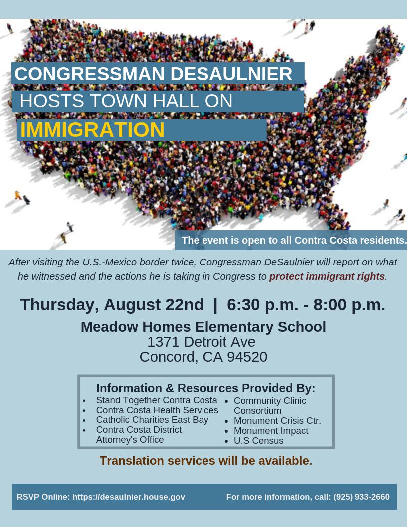 Join us on Thursday for a town hall in Concord to discuss immigration. I will provide an update on my visits to detention facilities on the southern border & discuss the work we are doing in Congress to protect immigrant rights. RSVP: https://desaulnier.house.gov/town-hall-rsvp pic.twitter.com/NcihbtKUm2
