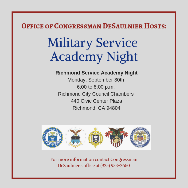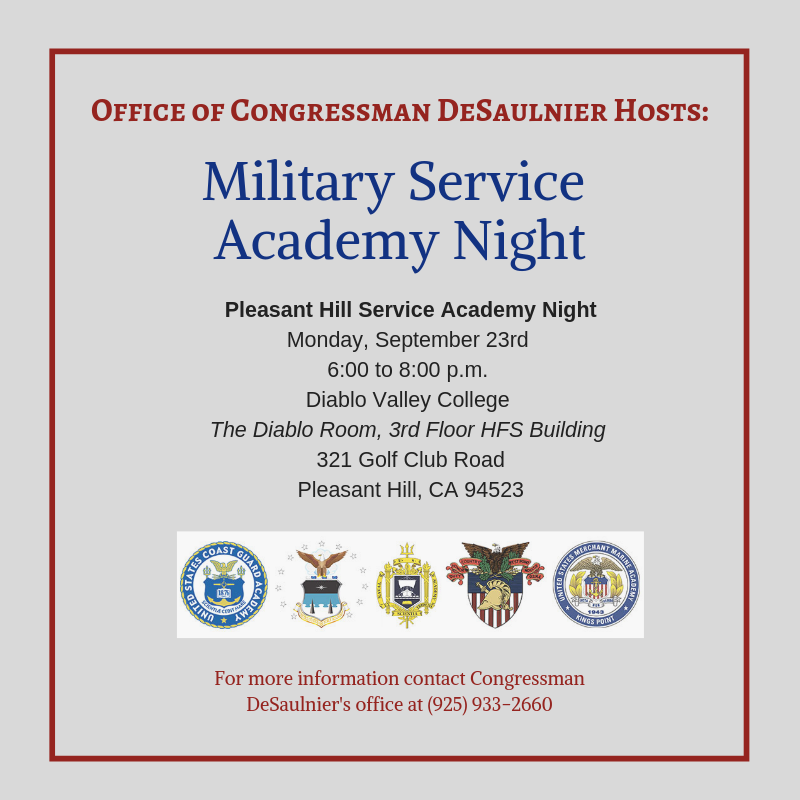 If you are interested in attending a service academy, join my office and service academy representatives for Academy Night on Monday, September 23rd at 6:00 p.m. at Diablo Valley College or Monday, September 30th at 6:00 p.m. at the Richmond City Council Chambers.pic.twitter.com/uhUMDlQMvA