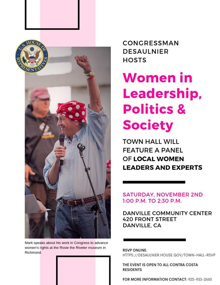Join us in Danville this Saturday for a town hall on "Women in Leadership, Politics & Society.” We will discuss topics like the need to close the gender pay gap, protect women’s health care, increase female representation in government, & more. RSVP: https://desaulnier.house.gov/town-hall-rsvp pic.twitter.com/ezhTnkDurb