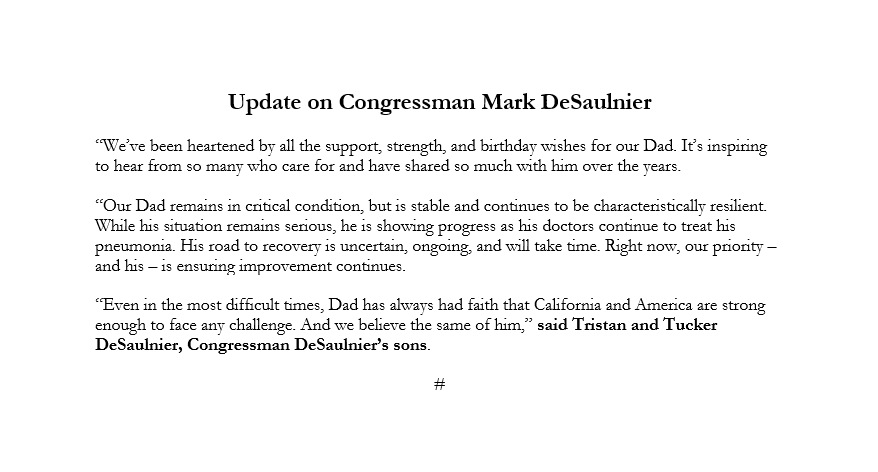 I check nearly every day for updates. Best wishes for Mark DeSaulnier's continued recovery.