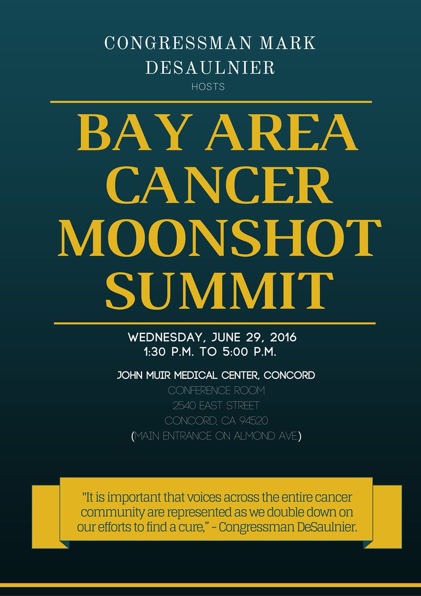 Join me June 29th for the first Cancer Moonshot Summit @ @johnmuirhealth in Concord. Details:http://bit.ly/1Uz5sHq pic.twitter.com/hdCLs8Uf7z