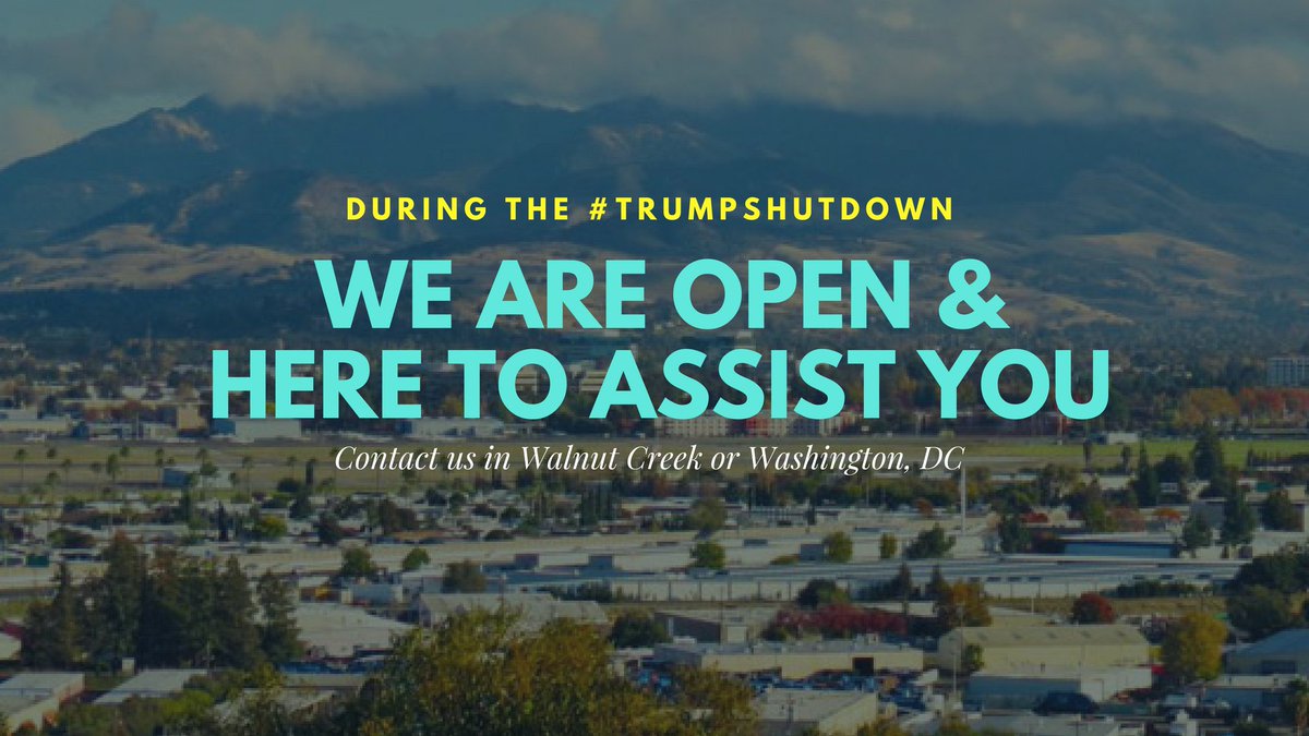 REMINDER: During the #TrumpShutdown, we are open & here to assist you. Please contact us if you have any questions or concerns. Staff and caseworkers are available in Walnut Creek (925-933-2660) until 4:00 pm PST & D.C. (202-225-2095) until legislative business is completed todaypic.twitter.com/hBSlUEt3N1