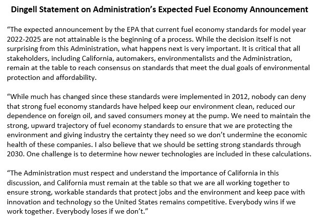 While EPA's expected announcement on fuel economy is not surprising from this Administration, it is critical that all stakeholders remain at the table to ensure strong standards that protect jobs & the environment. Everybody wins if we work together. Everybody loses if we don’t.pic.twitter.com/3KuottxMfB