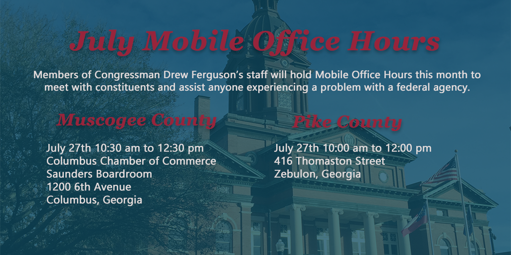 Our July Mobile Office Hours are tomorrow. Come join us in Pike and Muscogee Counties!https://twitter.com/RepDrewFerguson/status/1020381325314863104 …