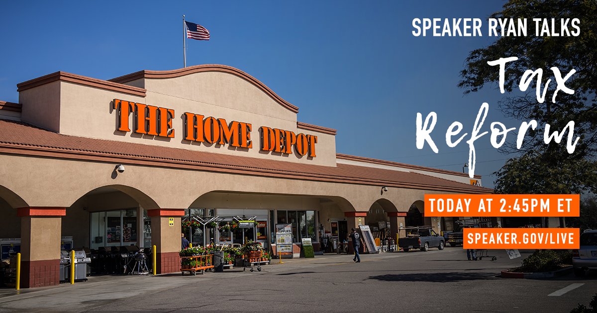 .@HomeDepot is one of the hundreds of companies that has rewarded its employees with bonuses because of #TaxReform. Tune in live at 2:45pm ET as I speak with their Atlanta employees about the new tax law.→ http://speaker.gov/live  pic.twitter.com/SX3T7uOhUM