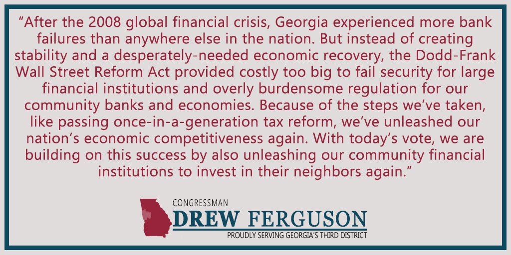 For too long, community banks in #GA03 have been burdened with one-size-fits-all regulations. That's why I was proud to vote to send a long overdue rollback of Dodd-Frank to President Trump's desk to be signed into law. Read my full statement below:pic.twitter.com/dAEs7VP7A2
