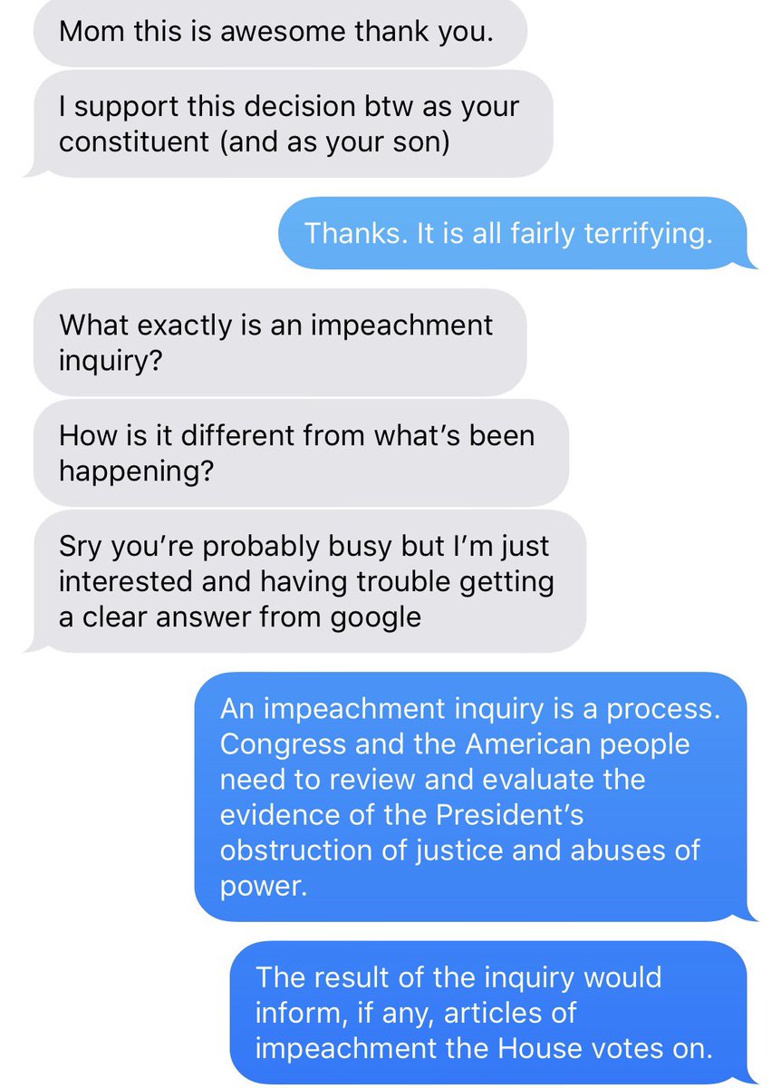 Many of you probably have the same questions about #ImpeachmentInquiryNow as my son. I thought I’d share our text exchange. pic.twitter.com/8ltogmoclf