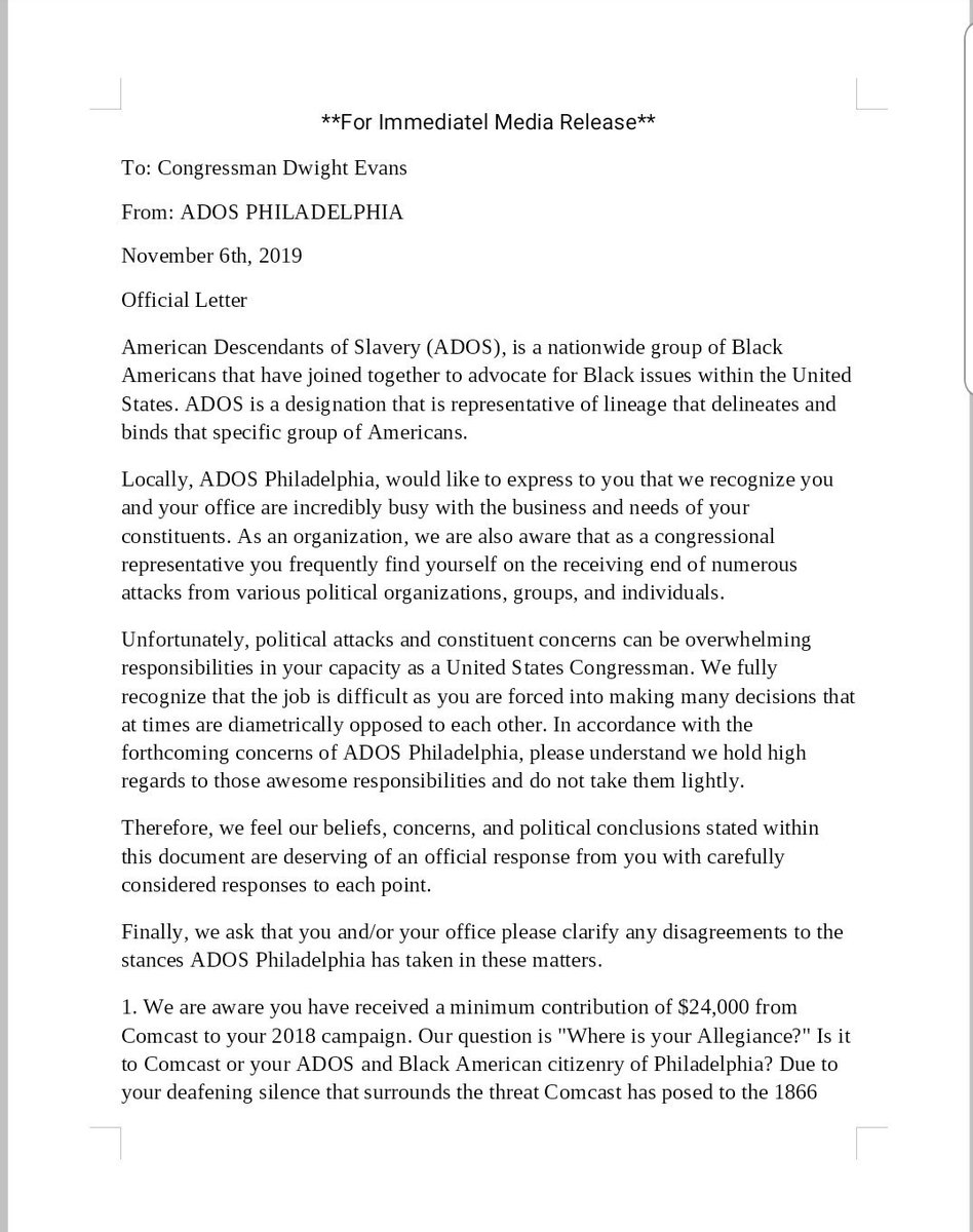 This letter was sent to @RepDwightEvans earlier this week by ADOS PHILADELPHIA regarding the 1866 Civil Rights Bill. Mr. Evans your silence will not be tolerated any longer! At this point you are complicit in the potential death of the #CivilRightsBillof1866! @comcast @tonetalks pic.twitter.com/OBe4S0OXtY
