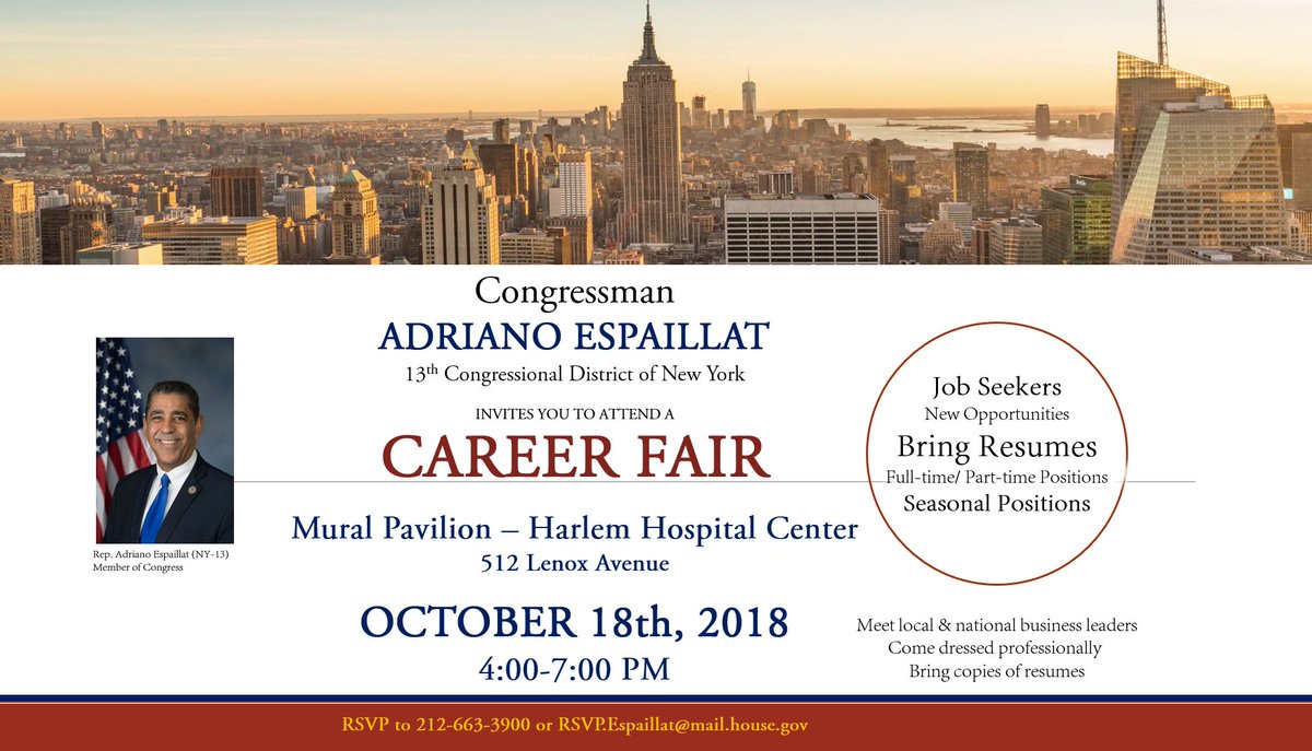 Join @RepEspaillat on Thursday, October 18th from 4:00 p.m. to 7:00 p.m. at the Mural Pavilion – #Harlem Hospital Center located at 512 Lenox Avenue for a career fair open to job seekers and employers throughout New York’s 13th congressional district. Bring resumes!pic.twitter.com/B8oUx1RyMQ