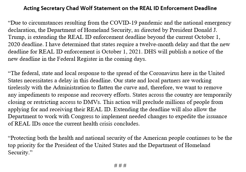 .@DHSgov pushed back the enforcement deadline for REAL ID one year to October 1, 2021, because of #COVID19.pic.twitter.com/wkE69P5sfI