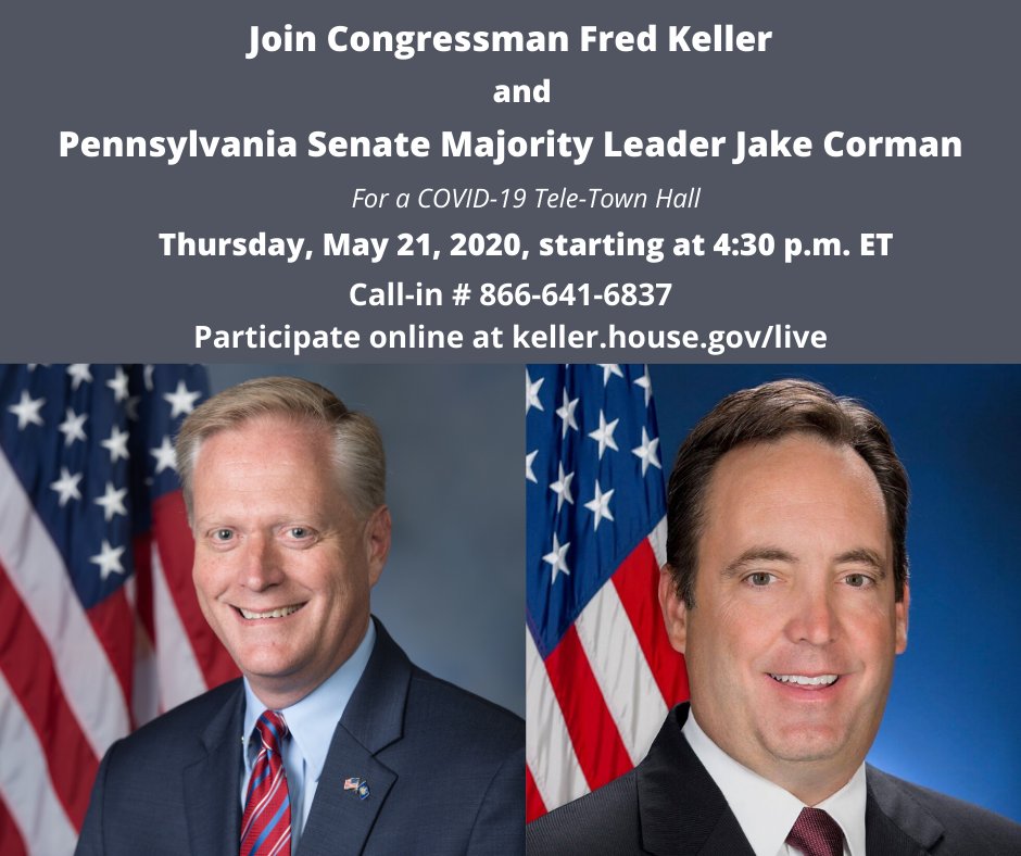 Excited to hold another #COVID19 tele-town hall on Thursday! This one will feature special guest Pennsylvania Senate Majority Leader @JakeCorman for an update on the state response. Details on how to join 👇pic.twitter.com/8FDr6ZVeSa