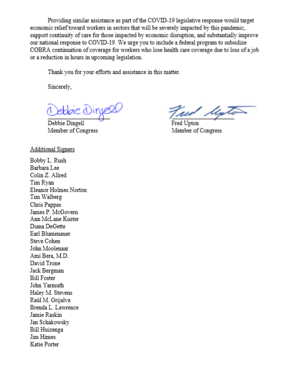 .@RepDebDingell and I are working with a number of our colleagues to bring down health care costs for unemployed workers. We need to strengthen federal assistance to people receiving continued health coverage under COBRA. #MI06pic.twitter.com/7bMdi3cRXw