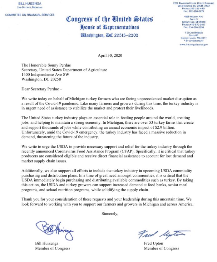 Sent a letter to @USDA w/ @RepHuizenga urging the federal govt. to support Michigan's turkey industry & I'm pleased to say that the USDA will purchase $50M in turkey products starting in July. This will certainly help our farmers & protect jobs here in #MI06.pic.twitter.com/Zn2xSSwRvx