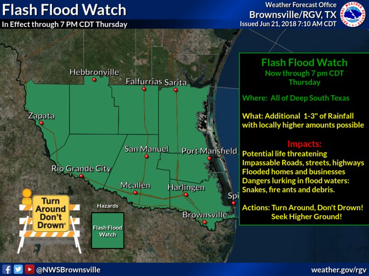 A #FlashFloodWatch has been extended throughout #RGV by @NWS until 7 p.m. CT on Thursday, June 21, 2018. I advise all residents in areas affected by heavy rainfall to be aware of flood zones and be alert of potential hazards. For updates, please visit: https://bit.ly/2logyTB pic.twitter.com/6h6XrS7S4A