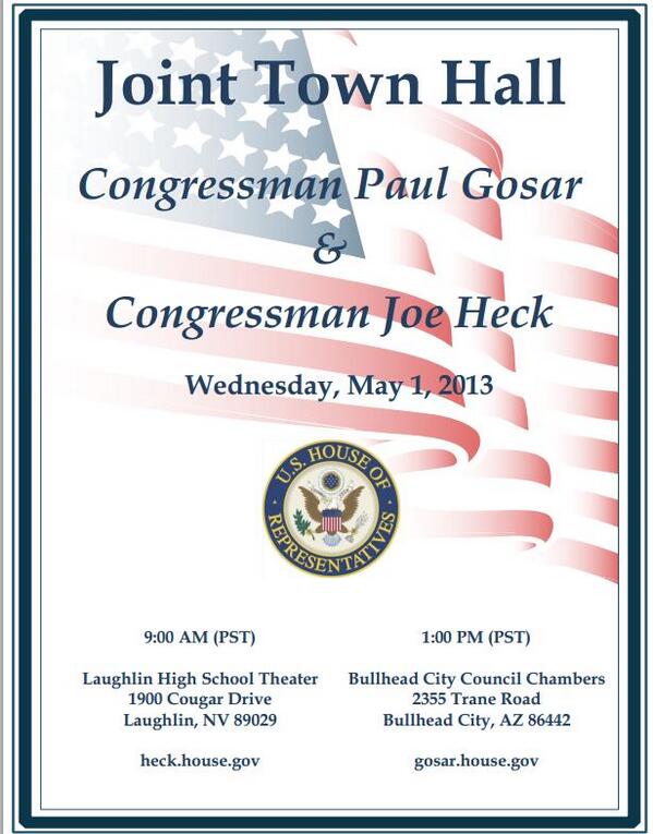 On Wed. May 1st @RepJoeHeck and I will hold joint town halls in #Arizona and Nevada. I hope to see you there.pic.twitter.com/o0sR5x3M99