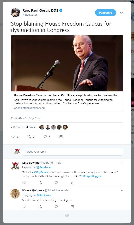 @RepGosar now has his own twitter-bots that appear to be russian? Pretty much textbook for bots right here in AZ!!!#CarpetBaggerThanks. Twitter will use this to make your timeline better. UndoUndo