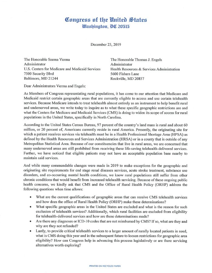 Telehealth is a vital resource for people who live in rural areas, especially eastern NC. That's why @RepRichHudson and I sent a letter to CMS and HRSA today asking how they are working to expand access to telehealth for the 60 million Americans who live in rural America.pic.twitter.com/9KcEvRsme1