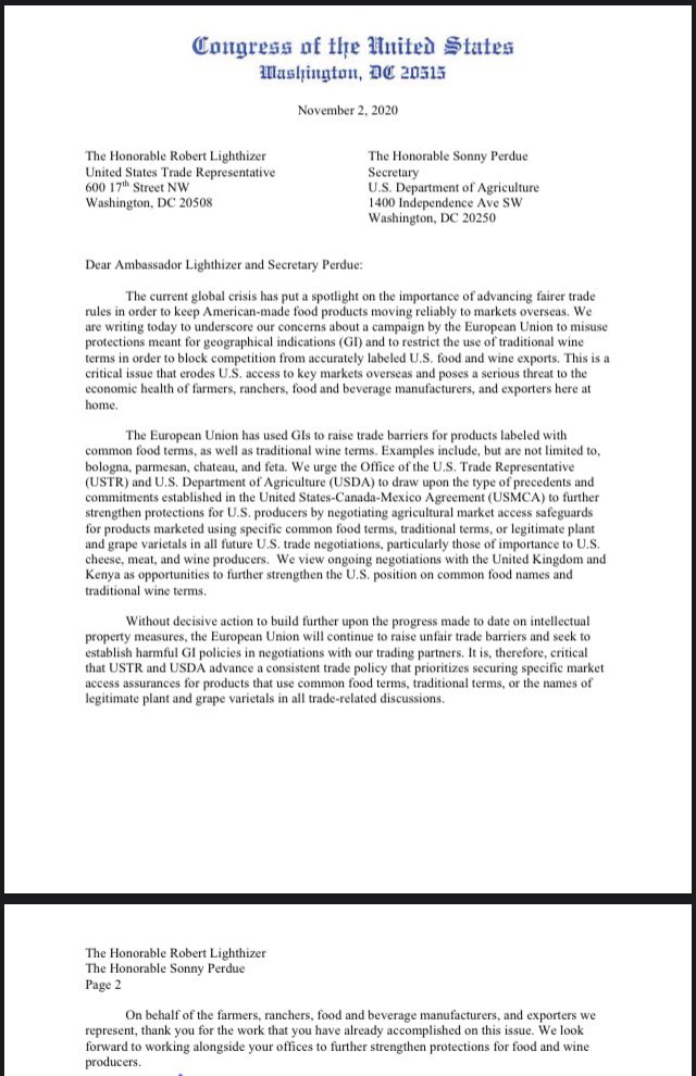 @USTradeRep and@SecretarySonny against the EU’s unfair trade barriers and effort to establish harmful GI policies in negotiations with our trading partners. We must prioritize strengthening protections for American producers.pic.twitter.com/x8aYMLDJ8Q