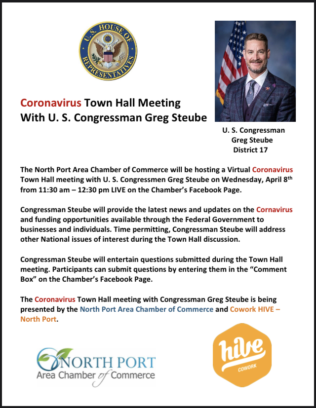 TOWN HALL ALERT: tomorrow I will be joining the North Port Area Chamber of Commerce for a virtual town hall from 11:30am-12:30pm LIVE on their Facebook page. I will answer your questions on the latest developments on #COVIDー19 and what resources can help your small business.pic.twitter.com/u3H9arvKhk