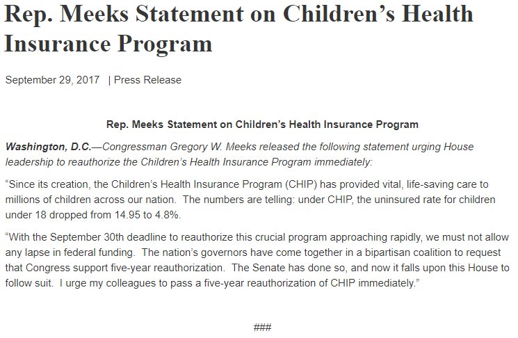 My Statement on Expiration of CHIP: "CHIP has provided vital, life-saving care to millions of children..." http://bit.ly/2wnPK9J pic.twitter.com/H1OokZiKfU
