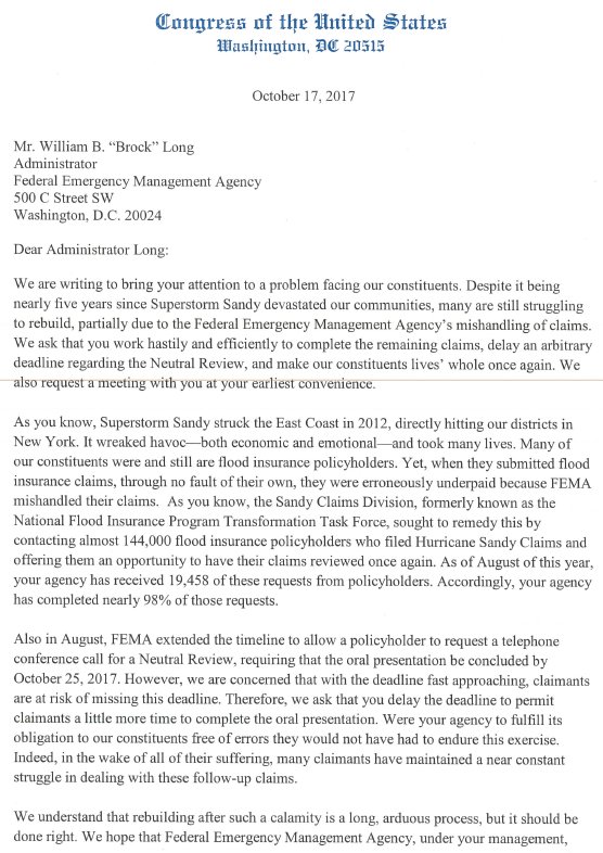 Rep. Meeks Leads Bipartisan NY Letter to FEMA Administrator Urging Completion of Hurricane Sandy Rebuilding Projects http://bit.ly/2hMbNkl pic.twitter.com/ZXWIn4tMqj