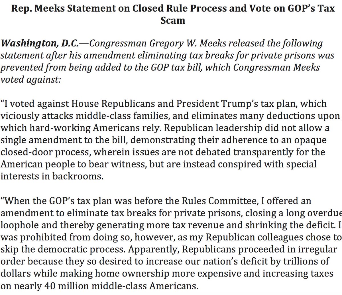 Rep. Meeks Statement on Closed Rule Process and No Vote on #GOPTaxScampic.twitter.com/0YIotNjPqj