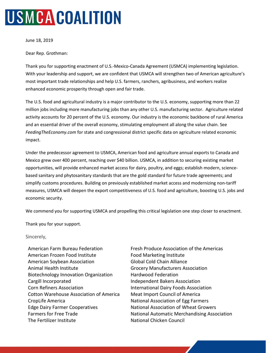 Thanks to @USMCACoalition for the nice letter! The #USMCA will bring a welcomed boost to our economy and will be especially beneficial to our #agriculture sector.pic.twitter.com/WLxoat3pX8