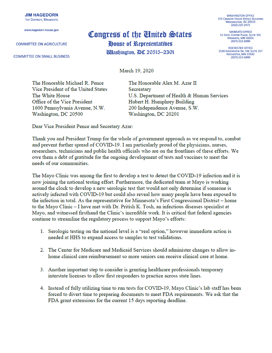 READ: My letter to @VP and @SecAzar about how we at the federal level can support the @MayoClinic's efforts to develop new testing methods and solutions to prevent further spread of #COVID19.pic.twitter.com/oKvsG4lI19