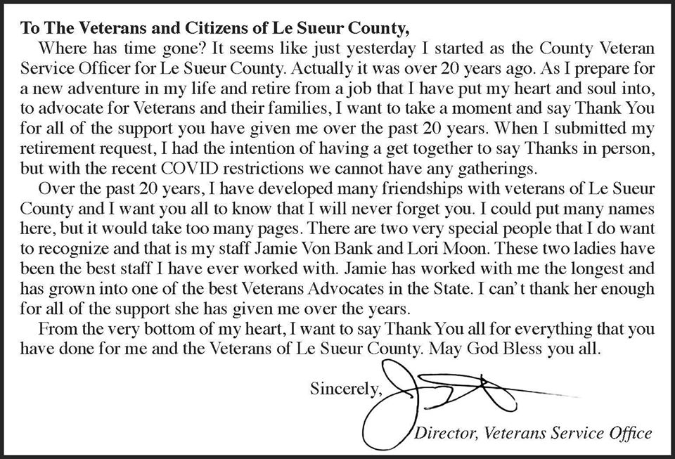 Jim is a great person, and has dedicated his career in helping Veterans in LeSueur Co., the State of Minnesota, and across the United States. Congrats Jim on your retirement.