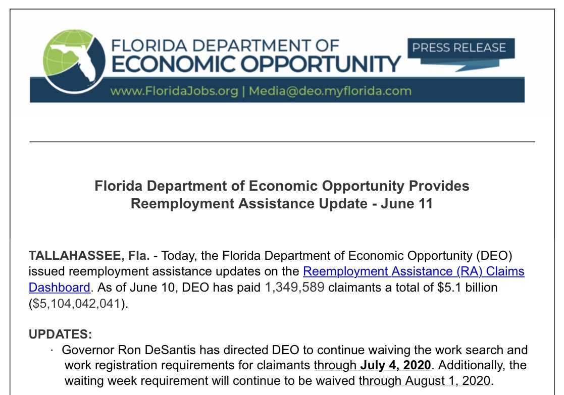 @FLDEO - work search and work registration requirements are now waived through JULY 4, 2020 for claimants. This refers to the requirement within CONNECT for individuals to provide proof of jobs they’re are applying to in order to continue receiving benefits.pic.twitter.com/kJfoOVvDWp