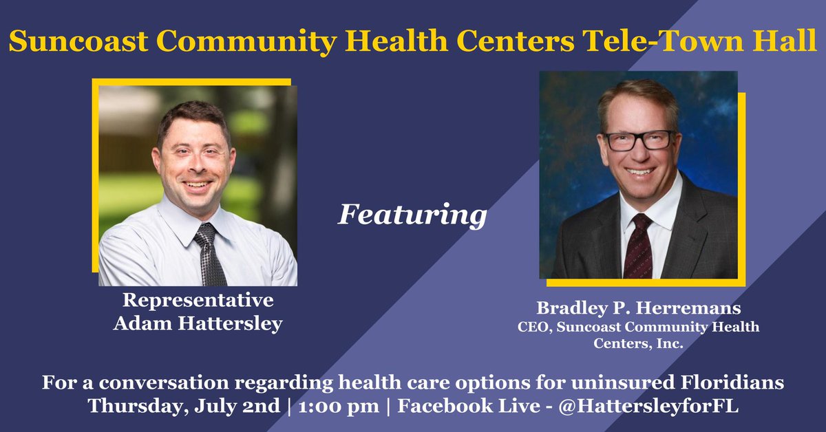 Please join us this Thursday, July 2nd for a live tele-town hall with Brad Herremans, CEO of Suncoast Community Health Centers! As FL continues to see a significant & steady spike in