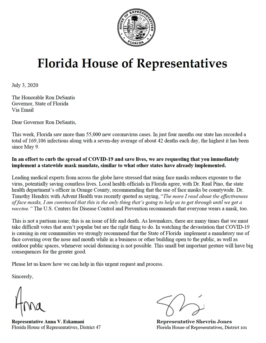 @GovRonDeSantis should follow the Gov. of Texas's lead (can't believe I'm saying this) and issue a statewide mask mandate in Florida. Today, I sent him this letter w/my colleagues, urging him to step-up and take this simple action to help slow the pandemic and SAVE LIVES now!