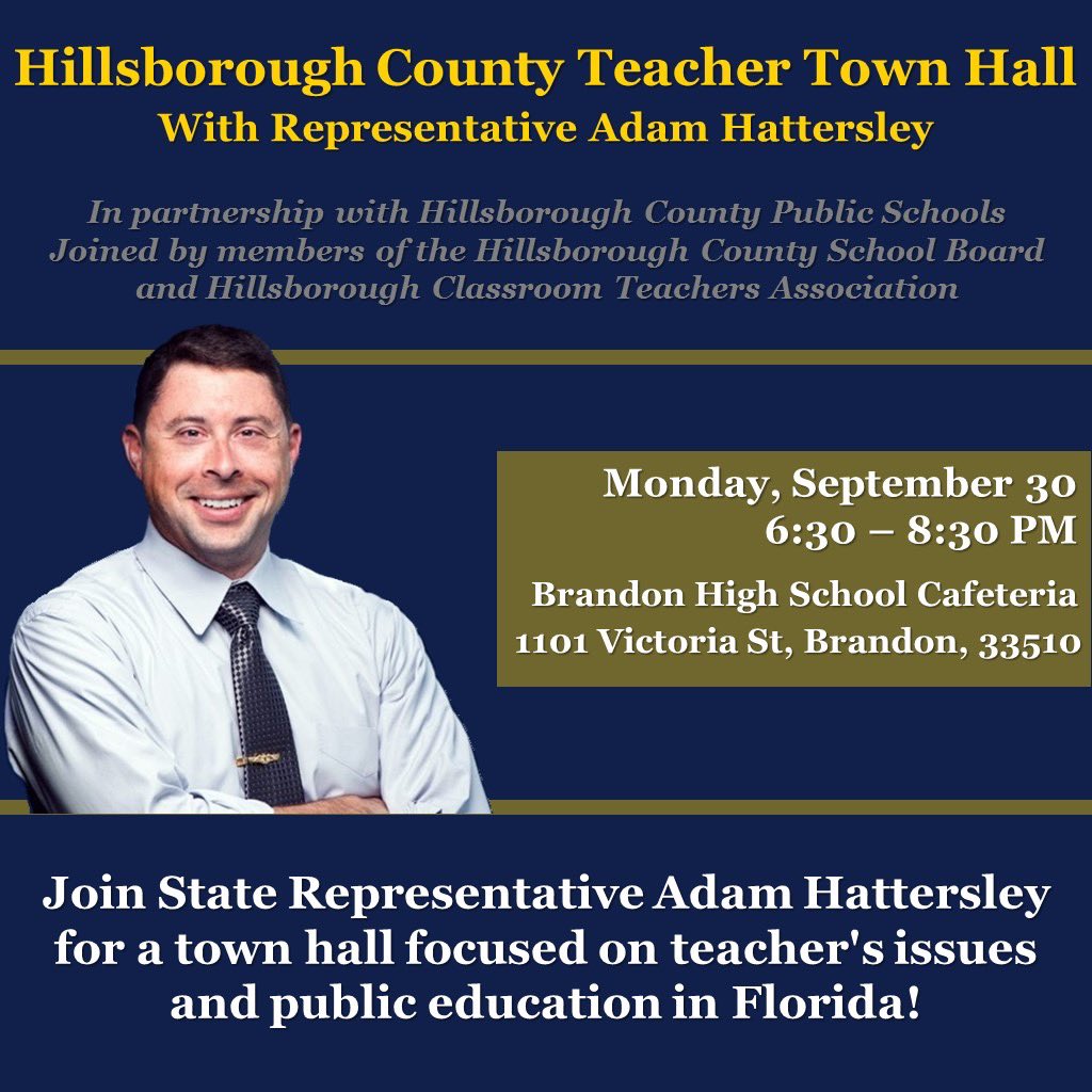 Please join us in partnership with @HillsboroughSch along with members of the Hillsborough County School Board and the @HillsboroughCTA on Mon., Sep. 30 at 6:30 pm at @BrandonHSEagles for a #TeacherTownHall! Contact Cassidy.Whitaker@myfloridahouse.gov with any questions! #FL59pic.twitter.com/fGRjHx4KYG