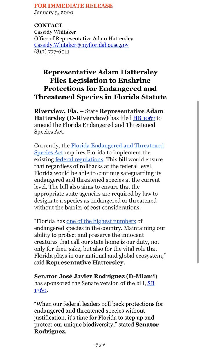 I’m very excited to share that I’ve officially filed HB 1067 to amend the Florida Endangered and Threatened Species Act. Currently, the Act is written to require Florida to implement the existing federal regulations under the landmark Endangered Species Act (ESA) of 1973. https://twitter.com/Fla_Pol/status/1213181565993402368 …pic.twitter.com/ubjTgOiSdM