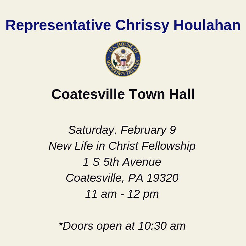 #PA06, ICYMI we are holding our third town hall of the 116th Congress this Saturday in Coatesville. If you have any questions, please call my office at 202-225-4315. Hope to see some of you there!pic.twitter.com/SVzuRnnwXa