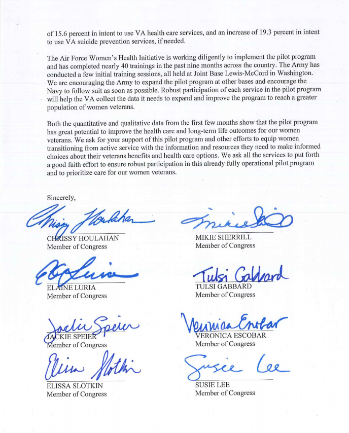 Last night, I led a bipartisan letter to the Army and Navy requesting that both branches pursue full participation in the @DeptVetAffairs Women's Health Transition Assistance program pilot, which is currently fully implemented in the Air Force. 1/pic.twitter.com/QvOpsGO8gR