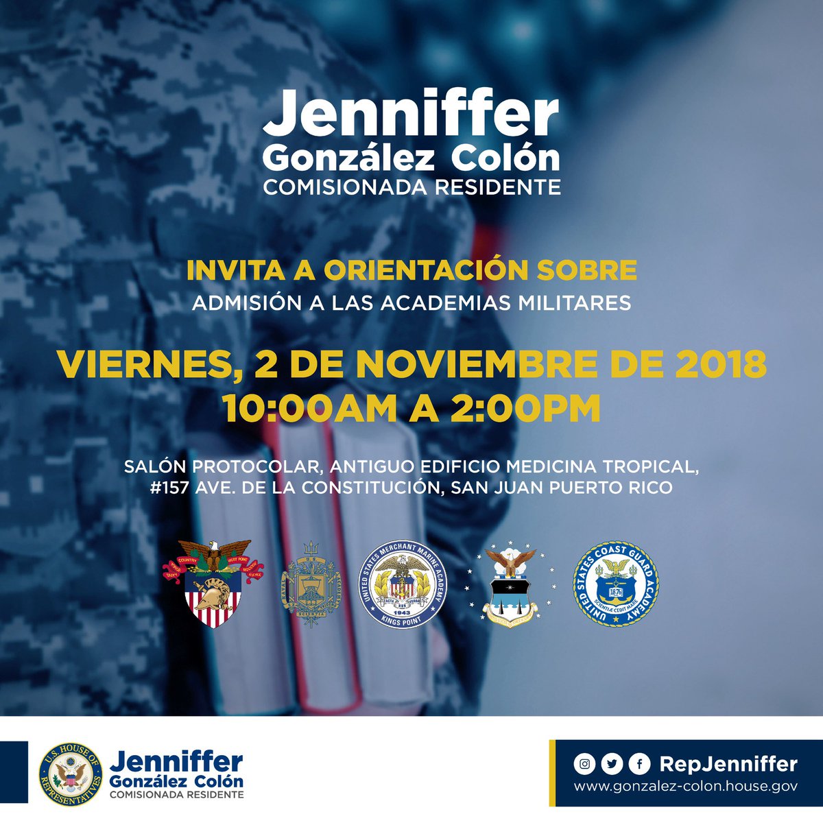 Invito a los estudiantes de escuela superior a orientación con oficiales de admisión de las academias militares que se llevará a cabo el mañana viernes, 2 de noviembre.pic.twitter.com/UoBJvBa0e9