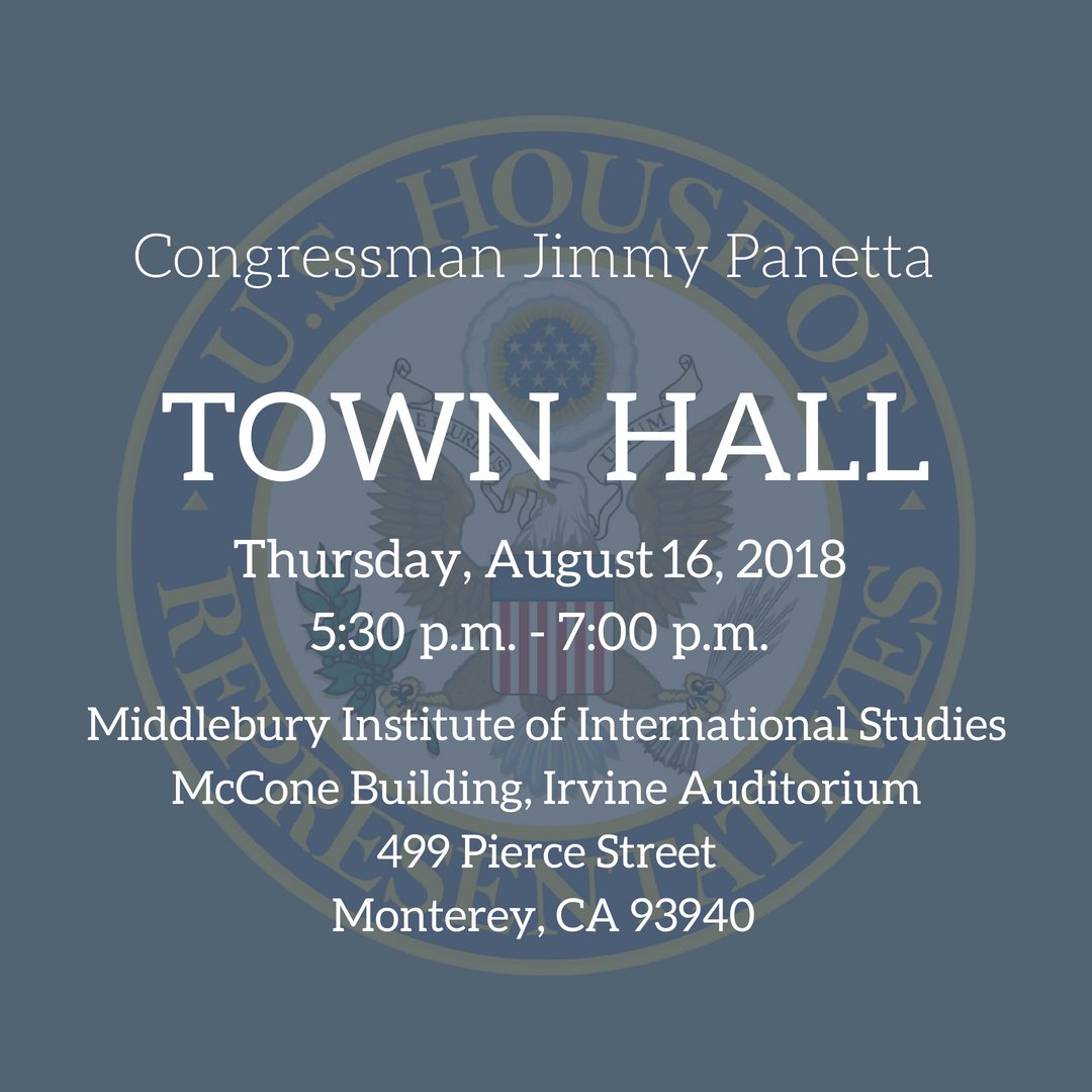 I will be holding a town hall in Monterey today, Thursday, August 16 from 5:30 p.m. to 7:00 p.m. Doors open at 5:00 p.m. Seating is first come, first served.pic.twitter.com/mPy3MOLMk1