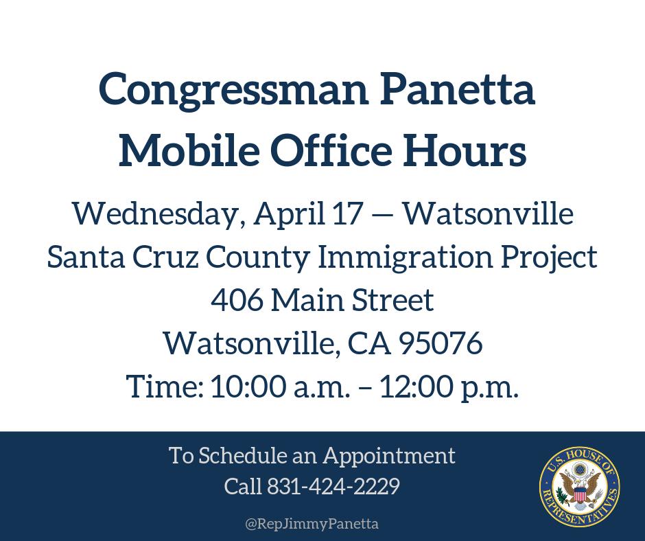 Mobile office hours in Watsonville tomorrow: Congressional staff members from my office will be available to assist constituents with issues concerning Social Security, Medicare, immigration, veterans affairs, expediting paperwork for passports, and more.pic.twitter.com/InT42LgxXB