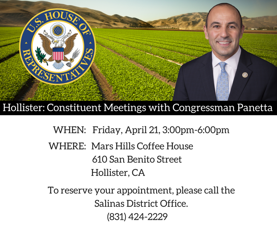 I'll be holding constituent meetings in Hollister on Friday, April 21. To schedule your appointment, please call my office: 831-424-2229pic.twitter.com/lOpXmZDlmO