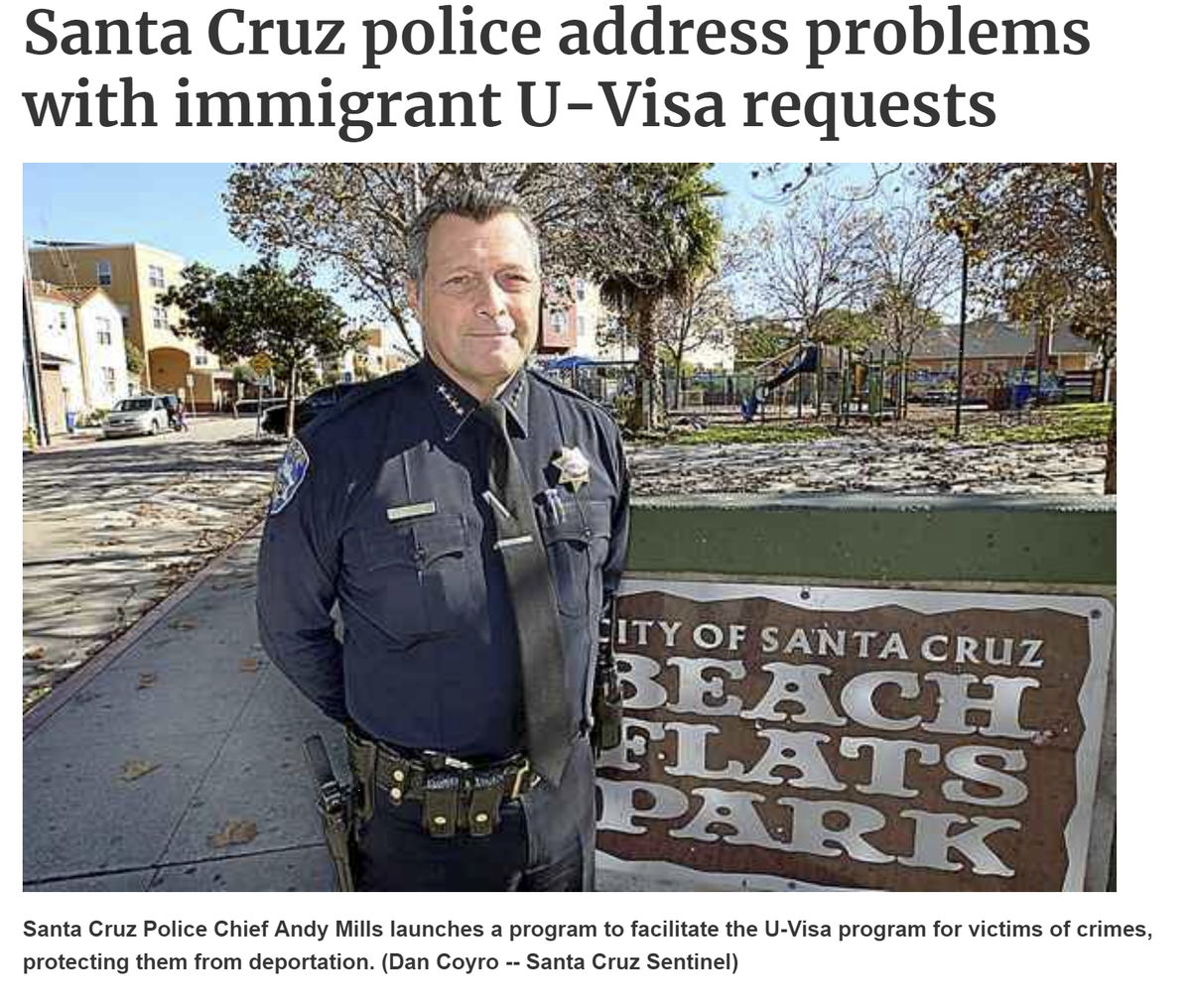 U-VISA program designed to encourage immigrants victimized by violent crime to cooperate w/ police & prosecutors w/o fear of deportation. Supports #communitypolicing & helps build cases against criminals. #SantaCruzPolice PRESS CONF-Monday 11/ 20 11:00am https://goo.gl/QH1ANC pic.twitter.com/N9fQO6O7CD