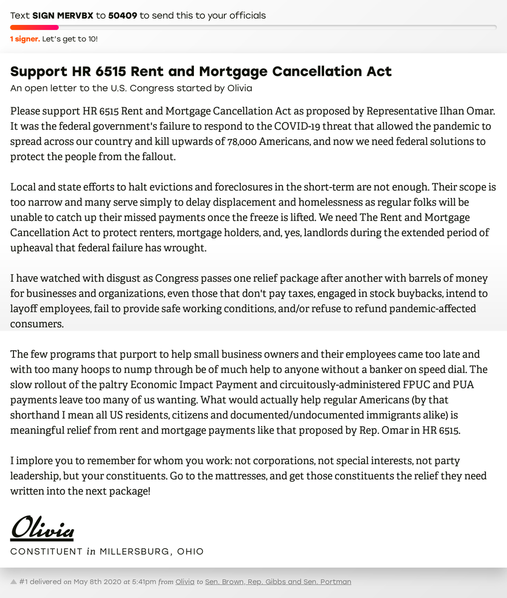 Support Olivia by signing “Support HR 6515 Rent and Mortgage Cancellation Act” and I’ll deliver a copy to your officials too: