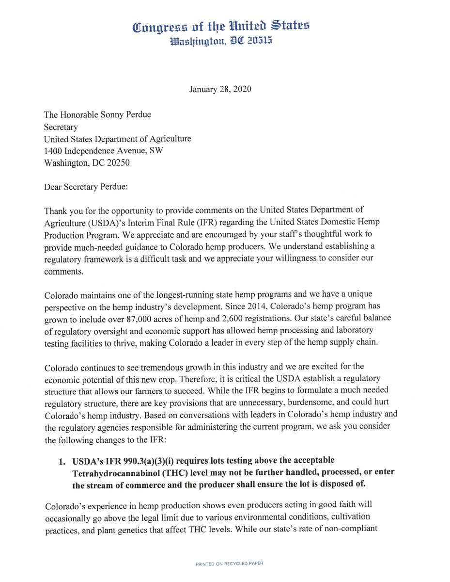Colorado is a leader in every step of the hemp supply chain, maintaining a careful balance of regulatory oversight and economic support. It is critical that the USDA establish a regulatory structure that allows our farmers to succeed.https://twitter.com/RepDianaDeGette/status/1222620855563251712 …